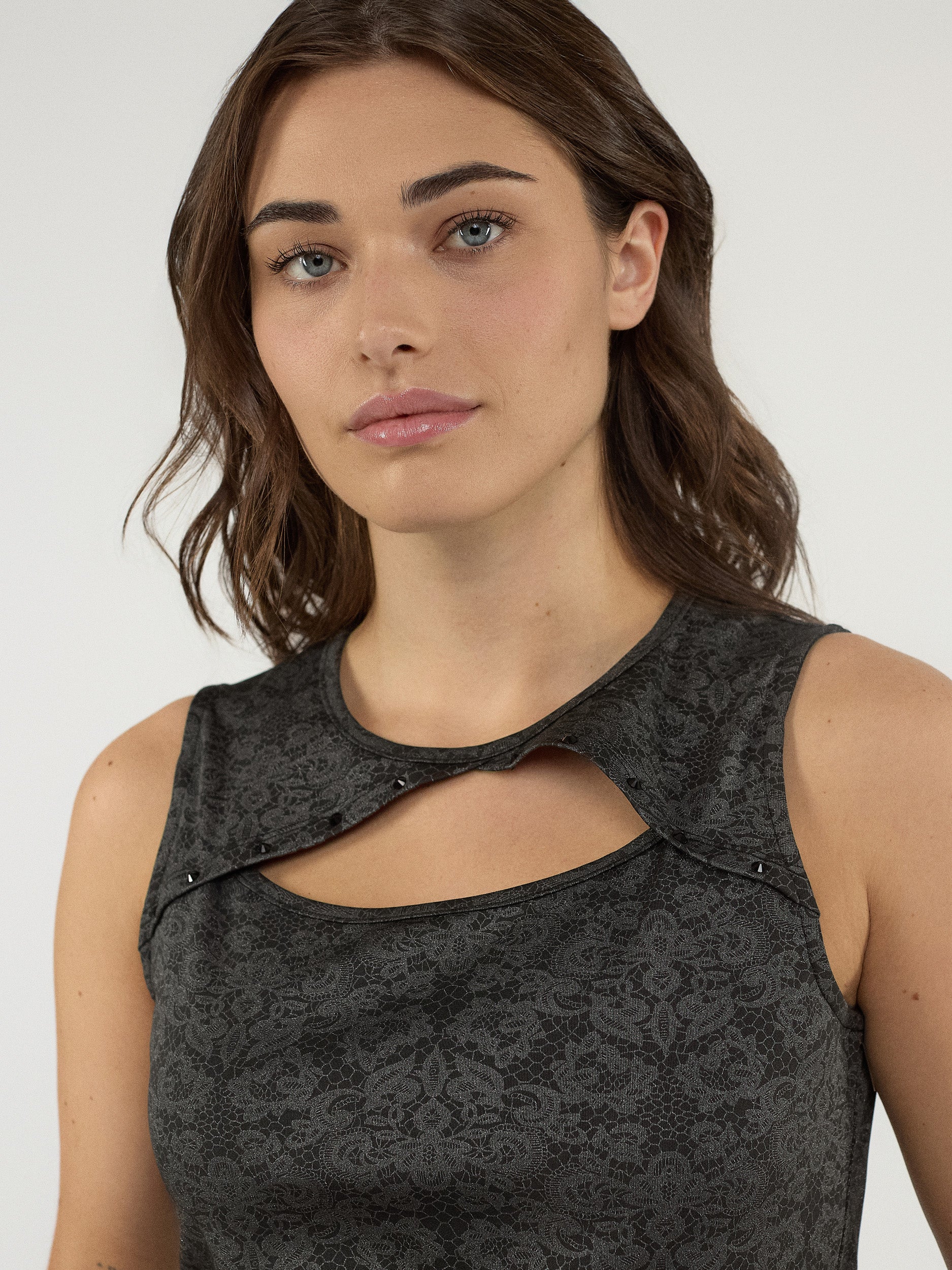 Avec son col asymétrique à découpe et son motif floral délicat, ce haut sans manches marie élégance et originalité. Les petits rivets ajoutent une touche finale raffinée.