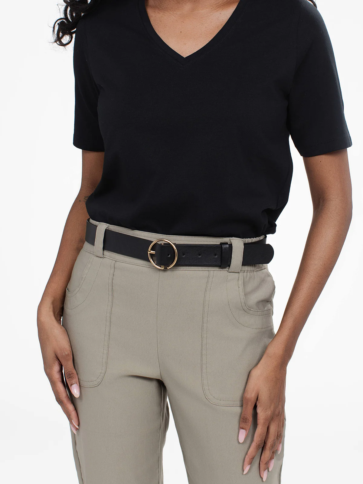 Ceinture en matière lisse avec boucle arrondie en métal brillant.