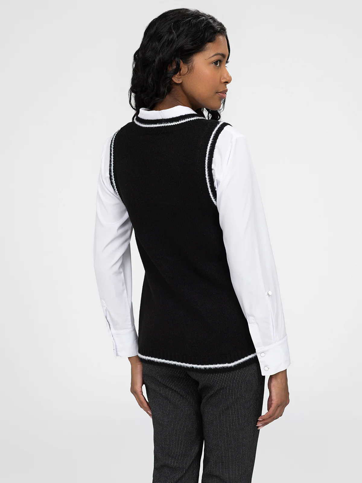 Chandail sans manches en maille à motif discret avec encolure en V et finitions bicolores. La coupe droite est dotée d’un ourlet légèrement incurvé et de bordures côtelées aux emmanchures.