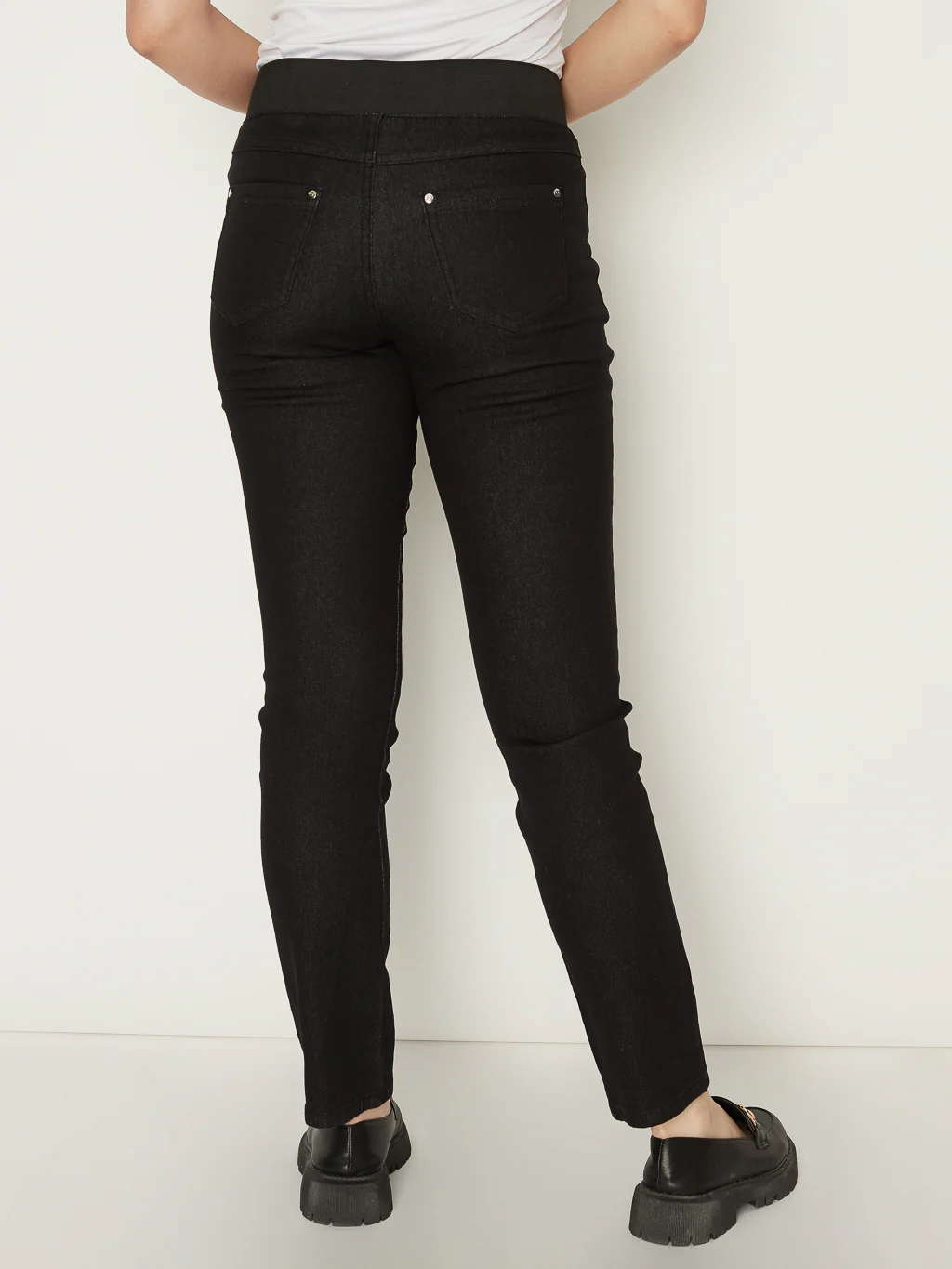 Pantalon denim à enfiler doté d'un élastique au dos et deux poches avant et arrière.