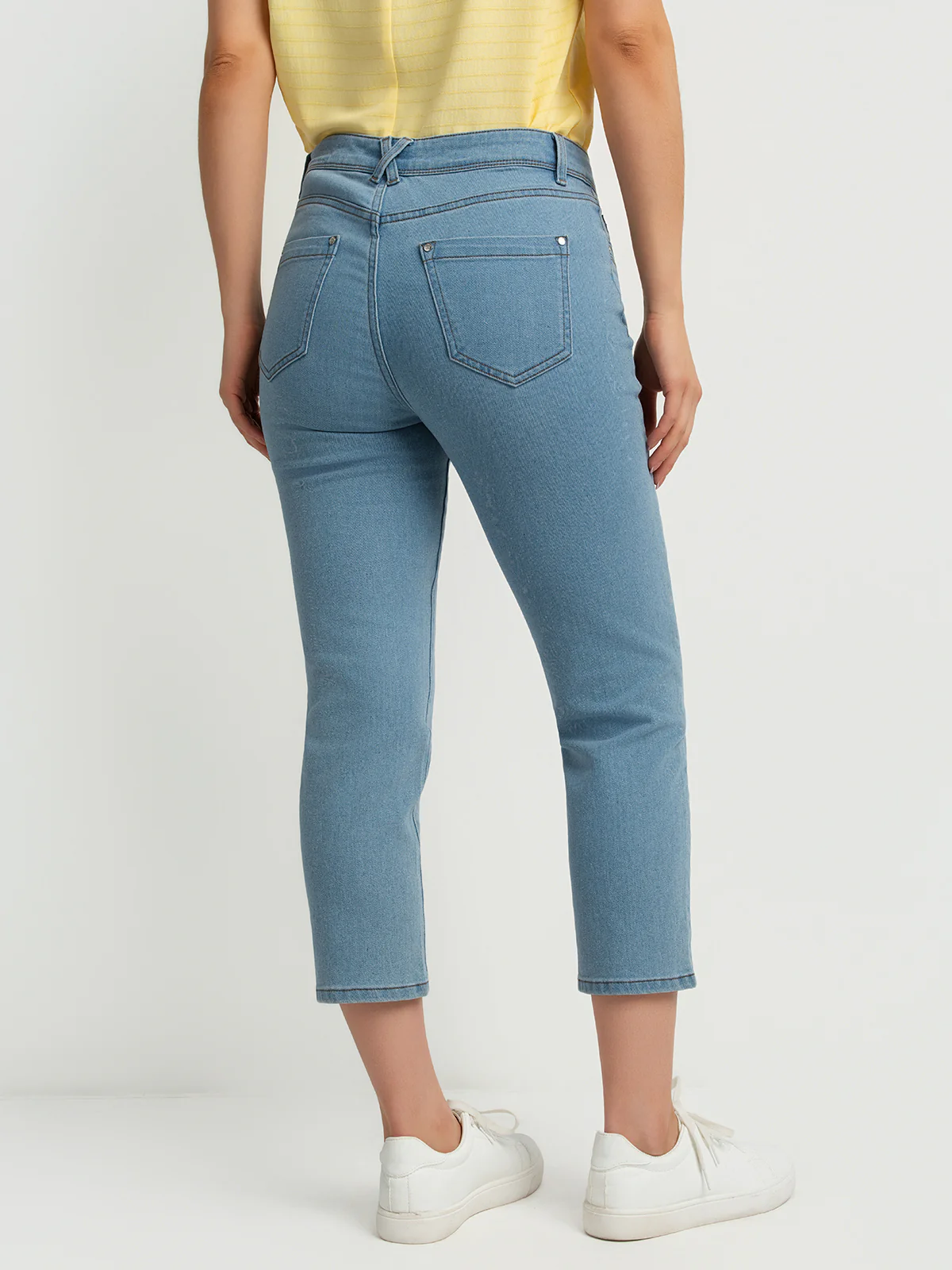 Jean étroit à la cheville comprenant des poches avant et arrière, des surpiqûres apparentes et un bas de jambe orné de boutons décoratifs latéraux.