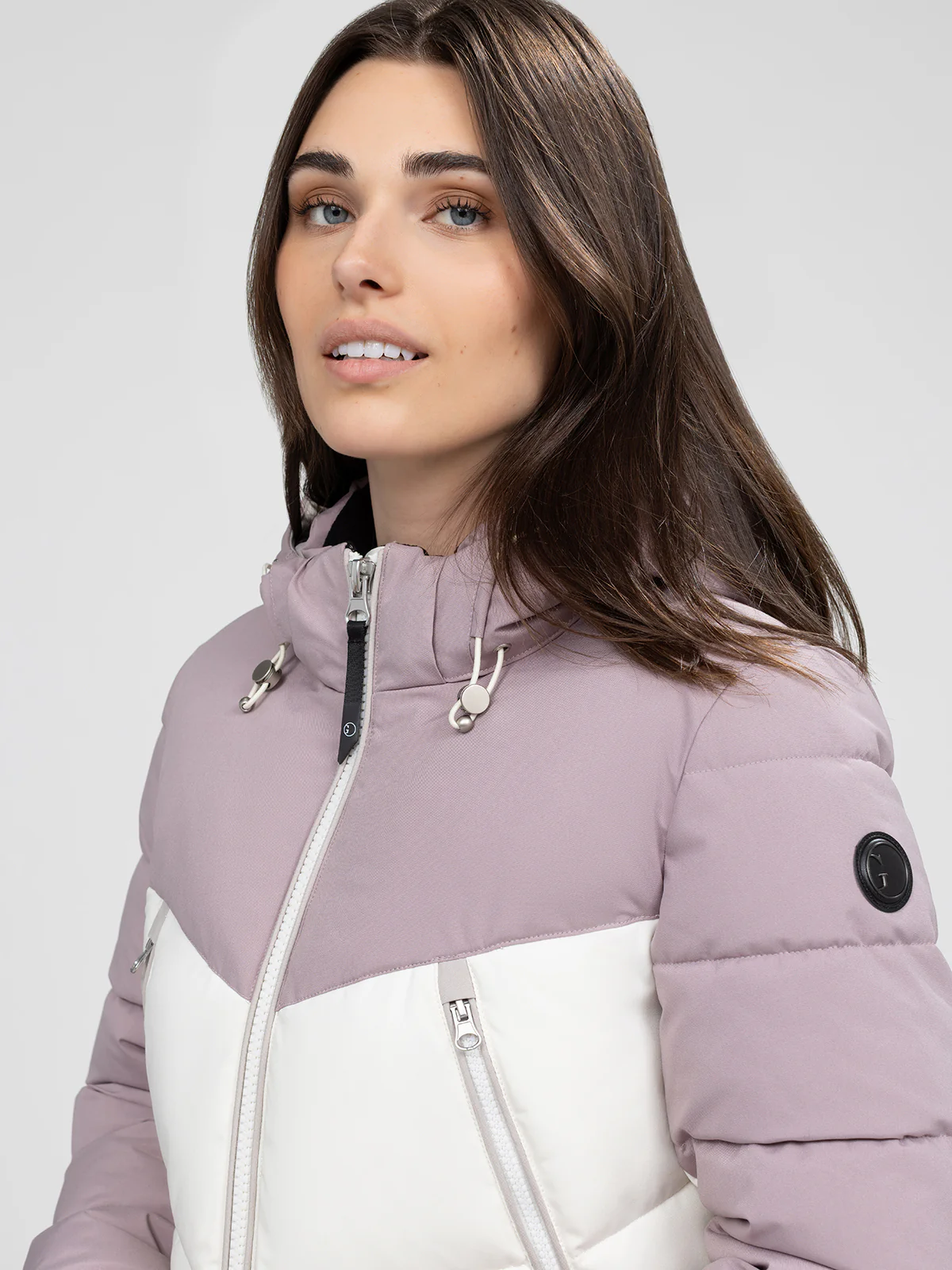 Manteau matelassé à capuche avec fermeture zippée centrale et cordons de serrage métalliques. Il présente deux poches zippées inclinées à l’avant, des manches longues à poignets droits avec bord-côte interne, et une structure en panneaux horizontaux et en chevrons.