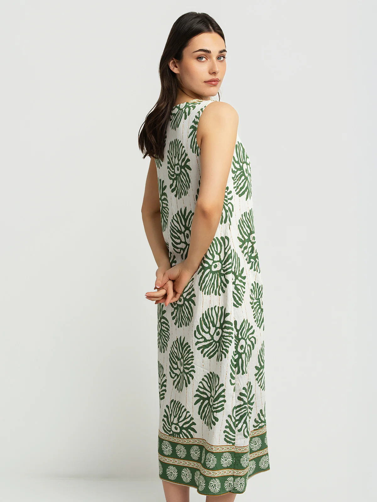 Robe sans manches en tissu tissé léger, avec encolure fendue et patte de boutonnage partielle sur le devant. Elle présente un imprimé à motifs végétaux contrastés, deux poches plaquées à l’avant et une bordure décorative en bas de jupe.