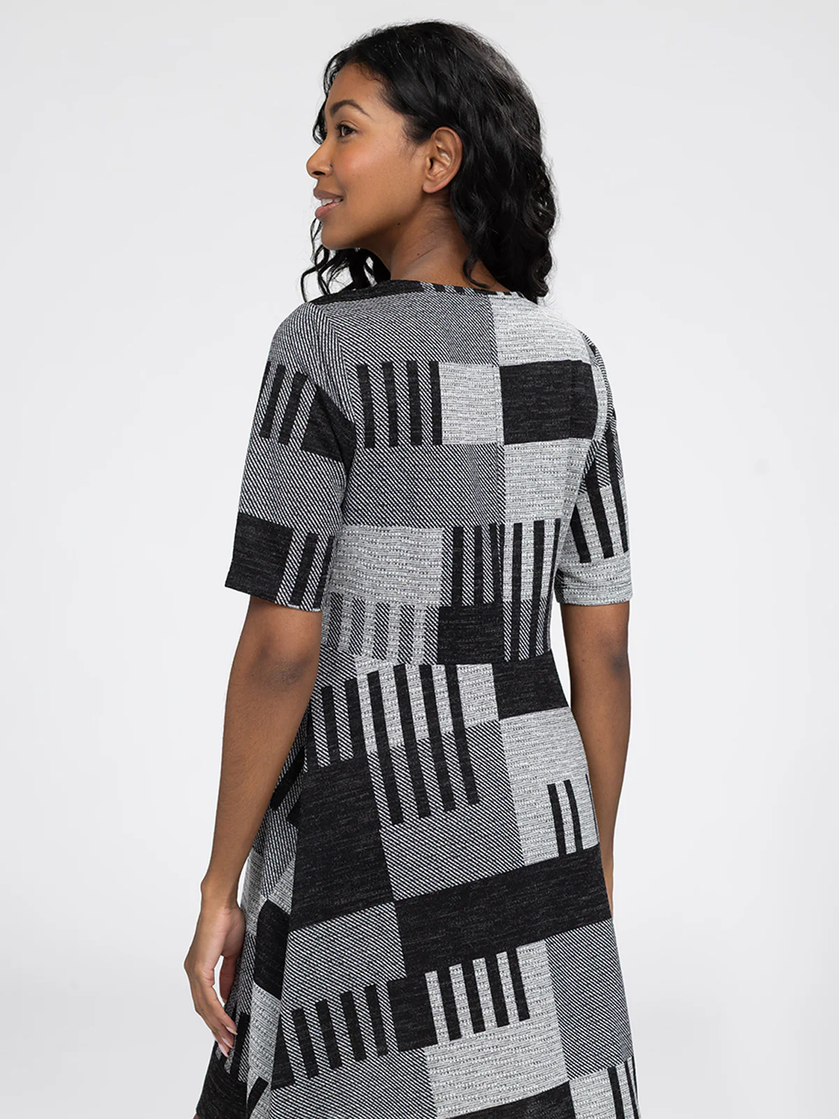 Robe structurée en jacquard extensible, avec manches courtes et jupe évasée. L’imprimé alterne des motifs texturés rectilignes et quadrillés.