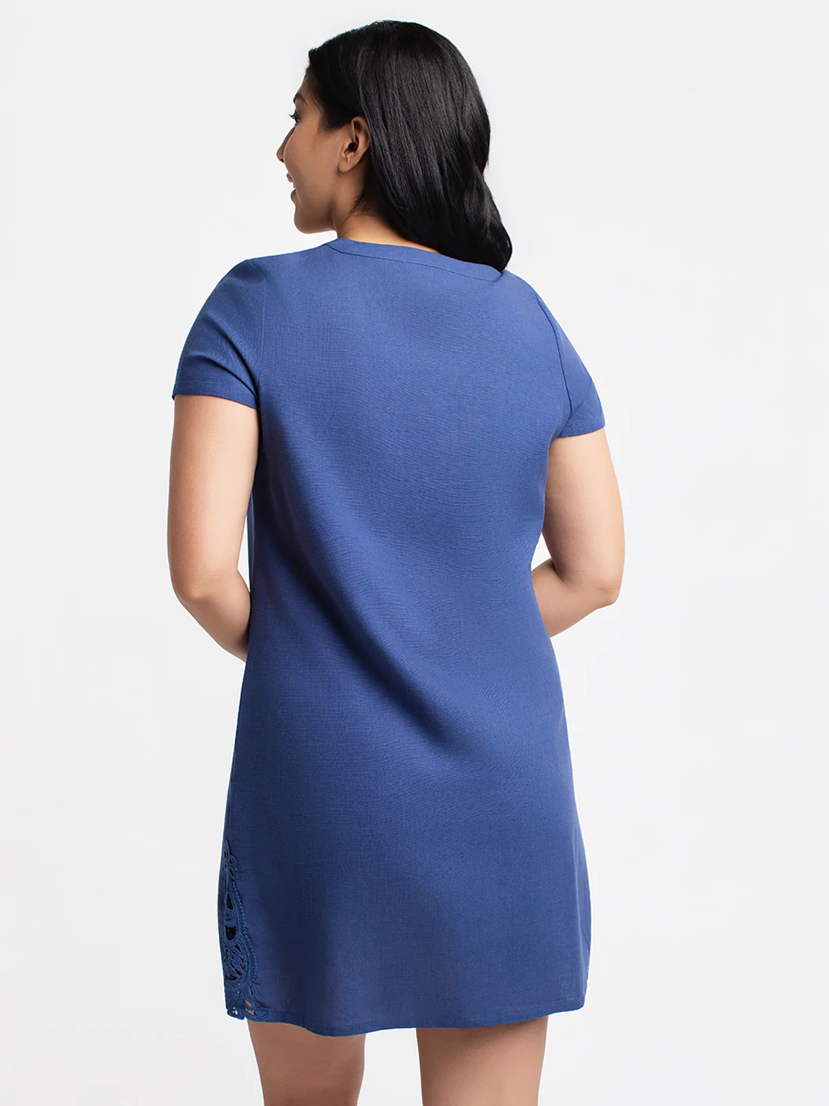 Elle présente des manches courtes, une coupe droite et un empiècement ajouré intégré sur le bas du côté.