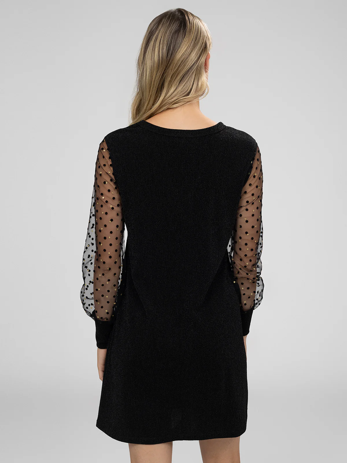 Robe à coupe droite, longueur au-dessus du genou, avec encolure ronde et ouverture en V au décolleté. Les manches longues bouffantes et l’empiècement supérieur sont en tulle à pois transparent avec poignets en maille côtelée.