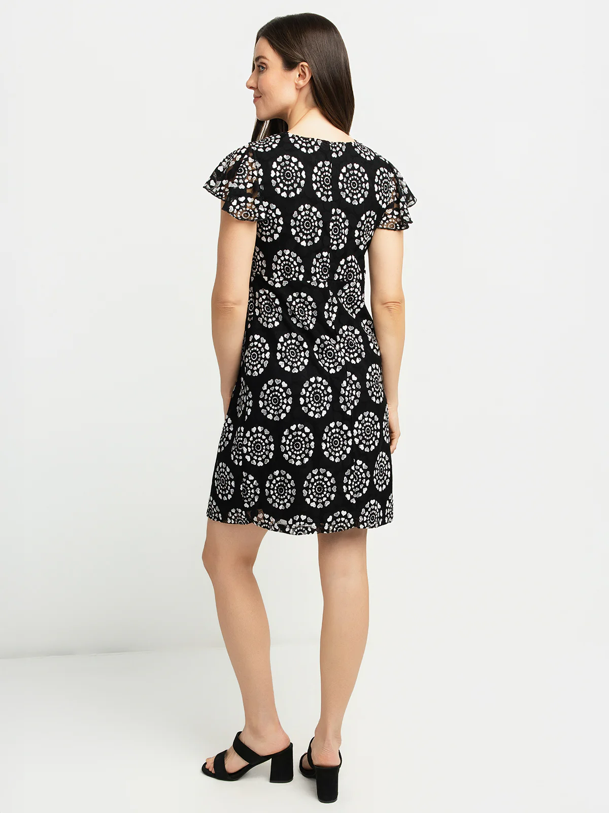 Robe midi ample avec imprimé de coeurs. Elle est dotée d’un col en V, de manches courtes volantées et d'une longueur au-dessus du genou.
