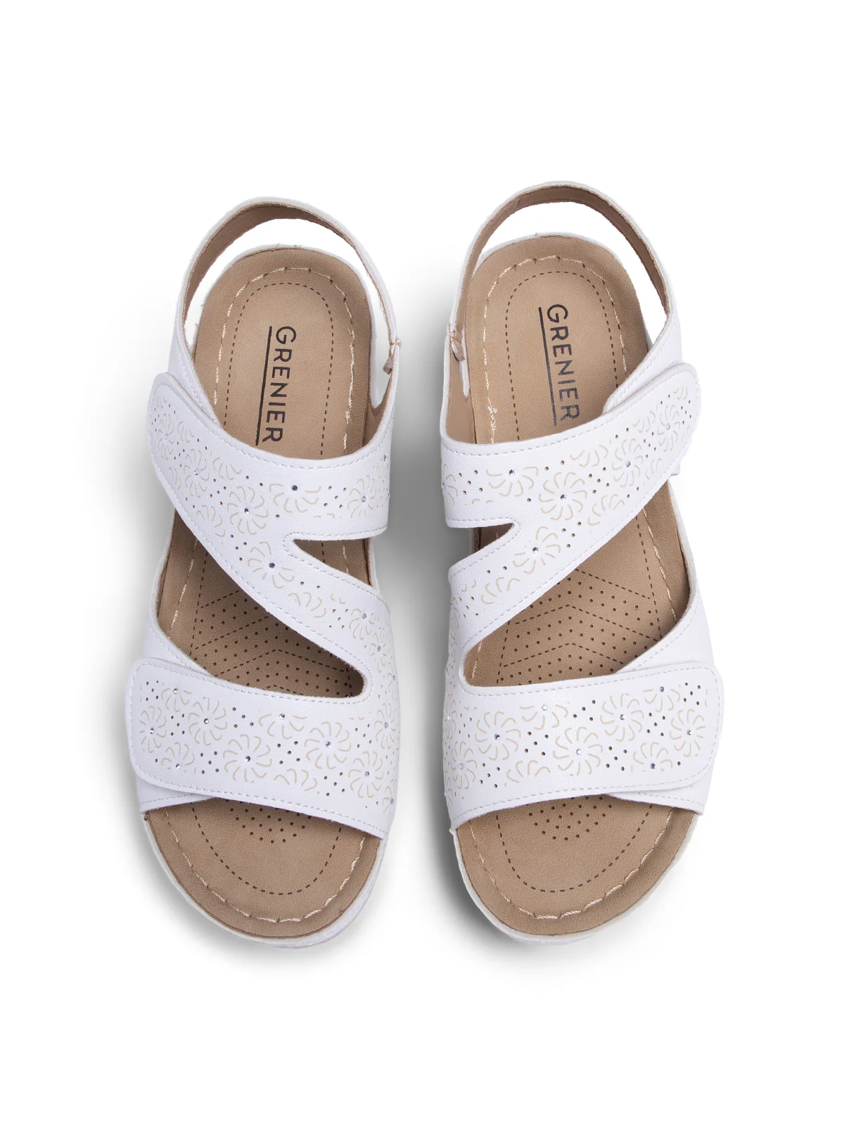Sandales ouvertes à talon compensé avec brides ajourées et détails perforés. Elles disposent d’une fermeture auto-agrippante, d’un talon compensé bicolore et d’une semelle extérieure à effet bois.