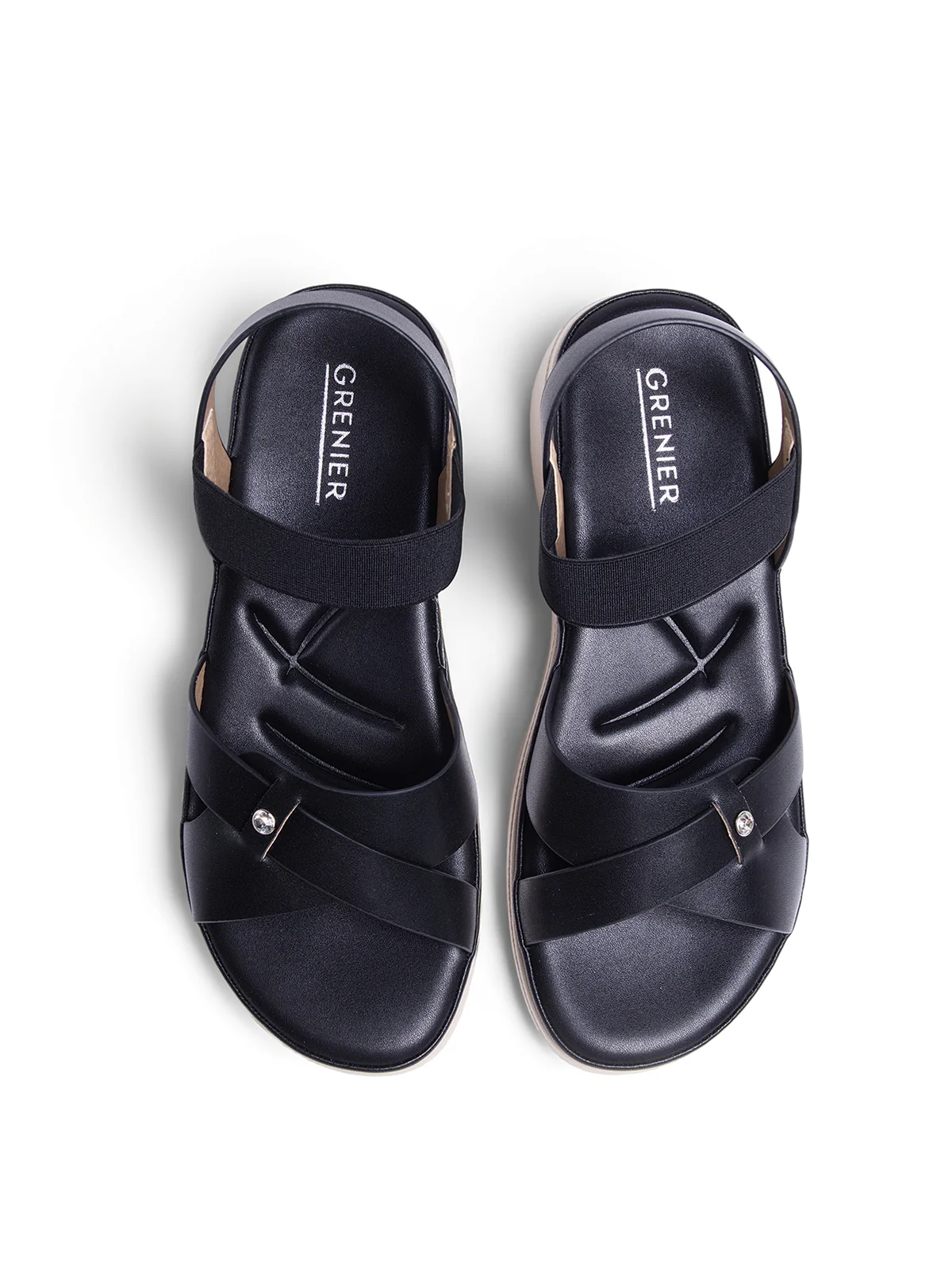 Sandales à plateforme avec empeigne structurée et détail métallique sur l’avant. Elles sont dotées d’une bride arrière extensible et d’une semelle extérieure épaisse à base claire.