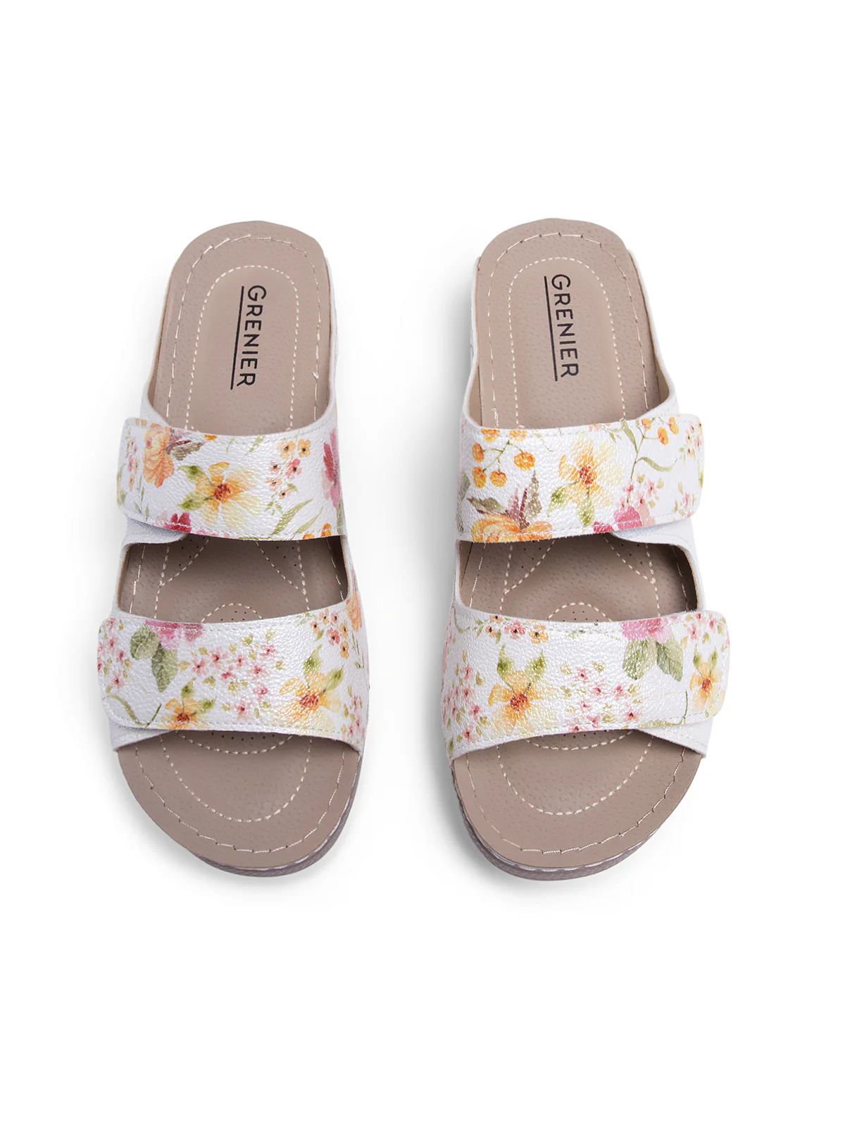 Sandales compensées à enfiler dotées de brides ajustables à fermeture autoagrippante. Elles présentent une semelle intérieure cousue, une plateforme intégrée et un motif floral imprimé.