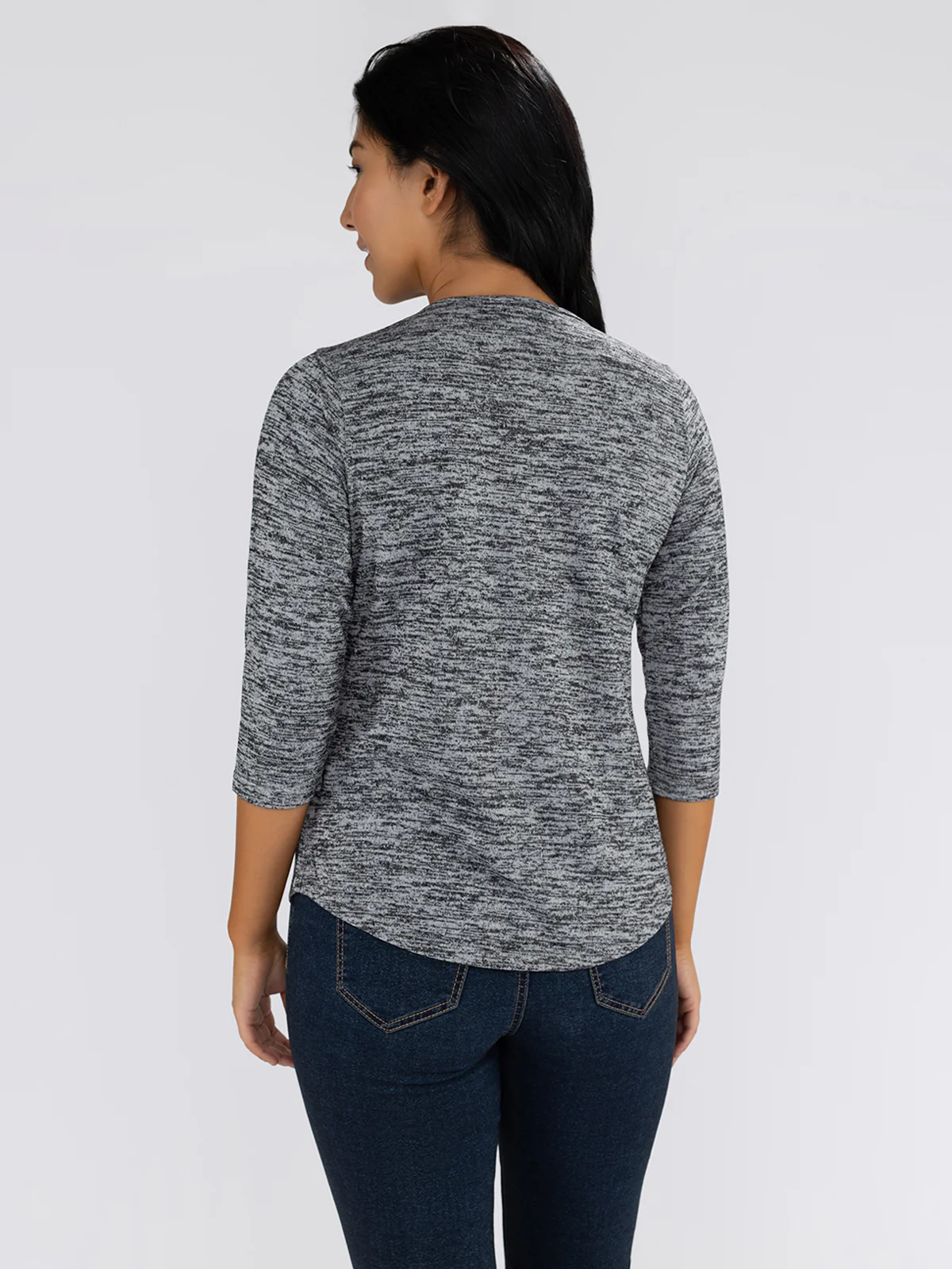 Ce t-shirt semi-ajusté est confectionné en jersey chiné extensible et présente des manches 3/4. Il est doté d’une encolure ronde avec une fermeture à glissière décorative à l’avant et d’un ourlet arrondi.