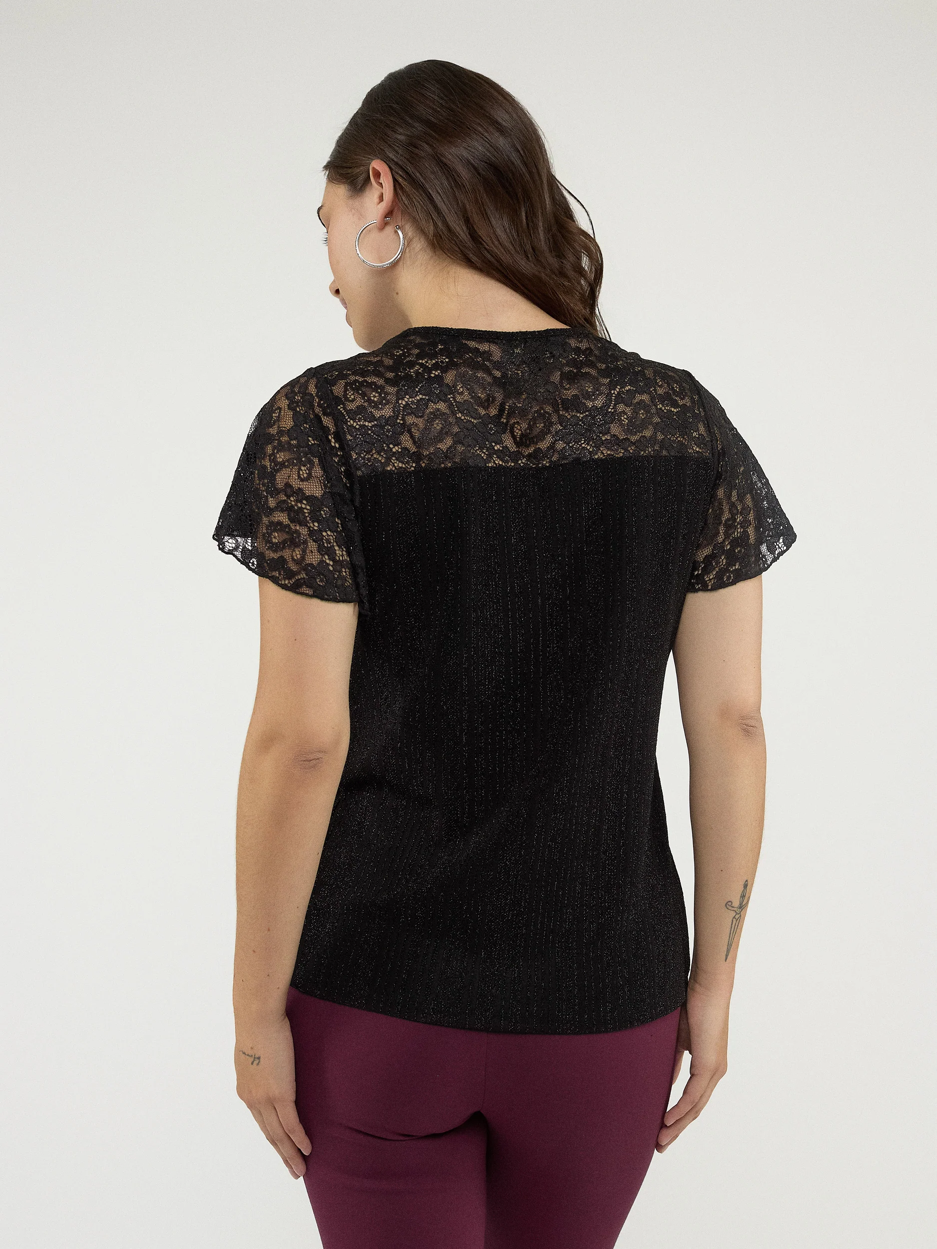 Avec son tissu noir scintillant et son empiècement en dentelle florale, ce haut est une pièce de caractère. Les manches courtes en dentelle dévoilent les bras avec délicatesse, tandis que la coupe droite assure une silhouette harmonieuse.