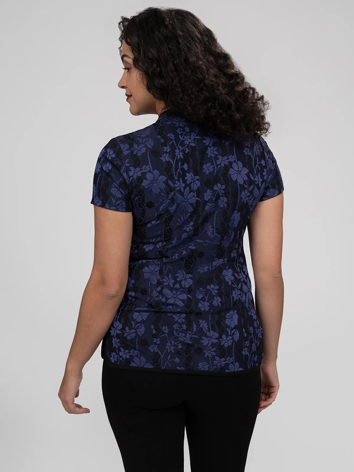 Le haut est conçu en textile jacquard à motifs floraux avec des manches courtes. L’encolure présente une forme montante avec une ouverture asymétrique entourée d’un biais contrasté.